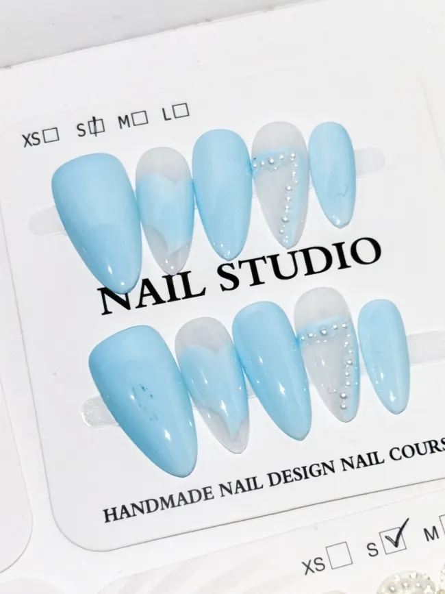 The Amadela baby blue press-on nails bring instant charm and a fresh, delicate look to your fingertips. Fresh baby-blue shades resemble a clear spring sky, while warm pearl accents mimic soft, cotton-candy clouds, creating a simple and healing aesthetic. Each nail is carefully hand-polished, giving a smooth and luxurious texture. Designed for reuse, this set is practical, eco-friendly, and perfect for girls who love the gentle, Japanese-fresh style.