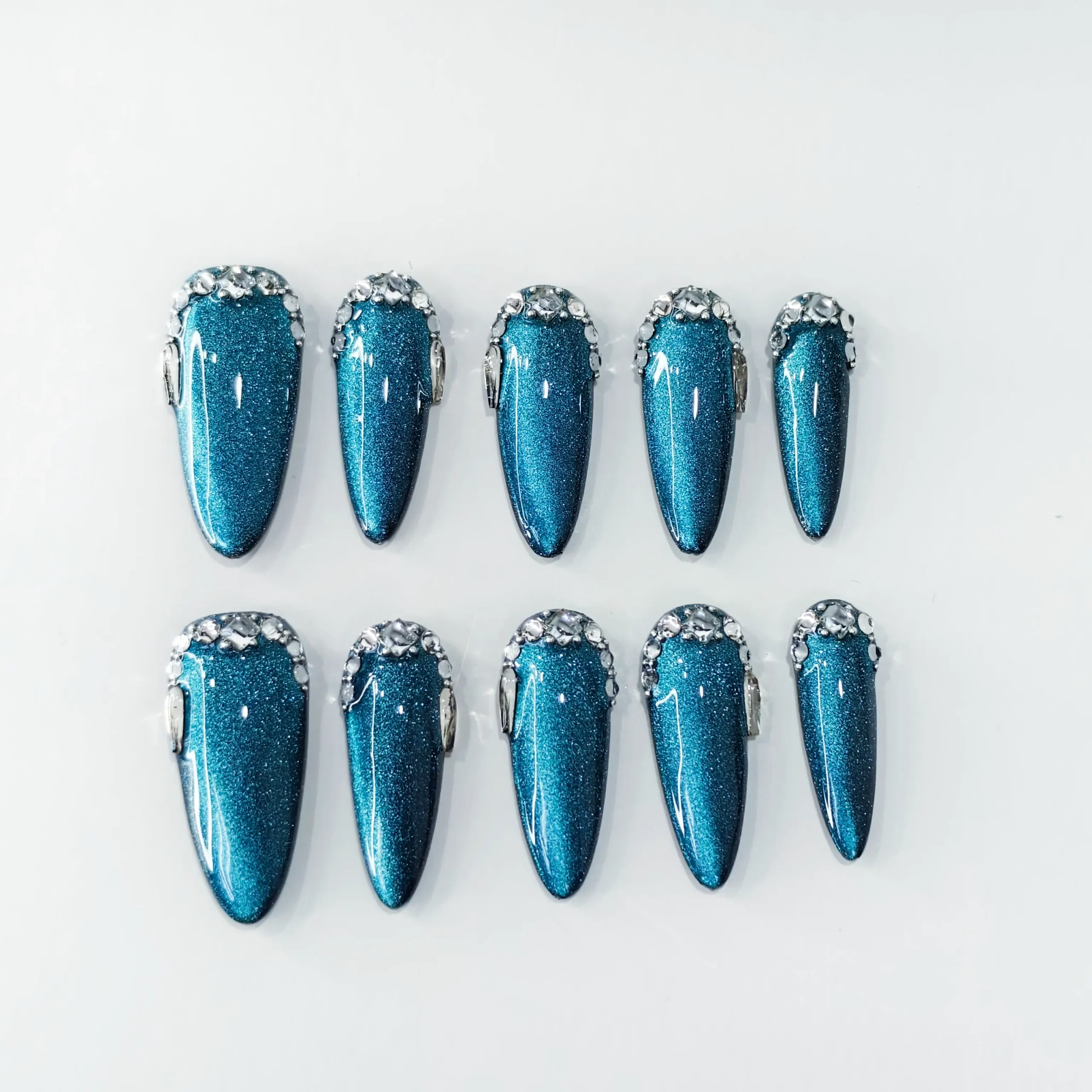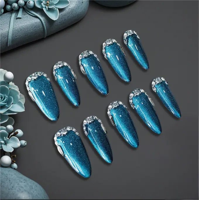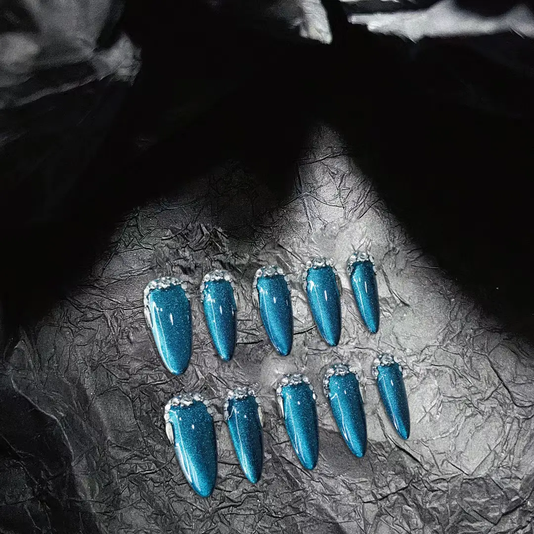 The background has a deep blue-green cat-eye effect, with fine glitter powder. Under the light, it presents a dynamic gradient of luster, resembling a transparent and mysterious deep-sea gemstone. The edge of the nail plate is adorned with a circle shiny diamond decoration, further enhancing the overall delicacy and magnificence.