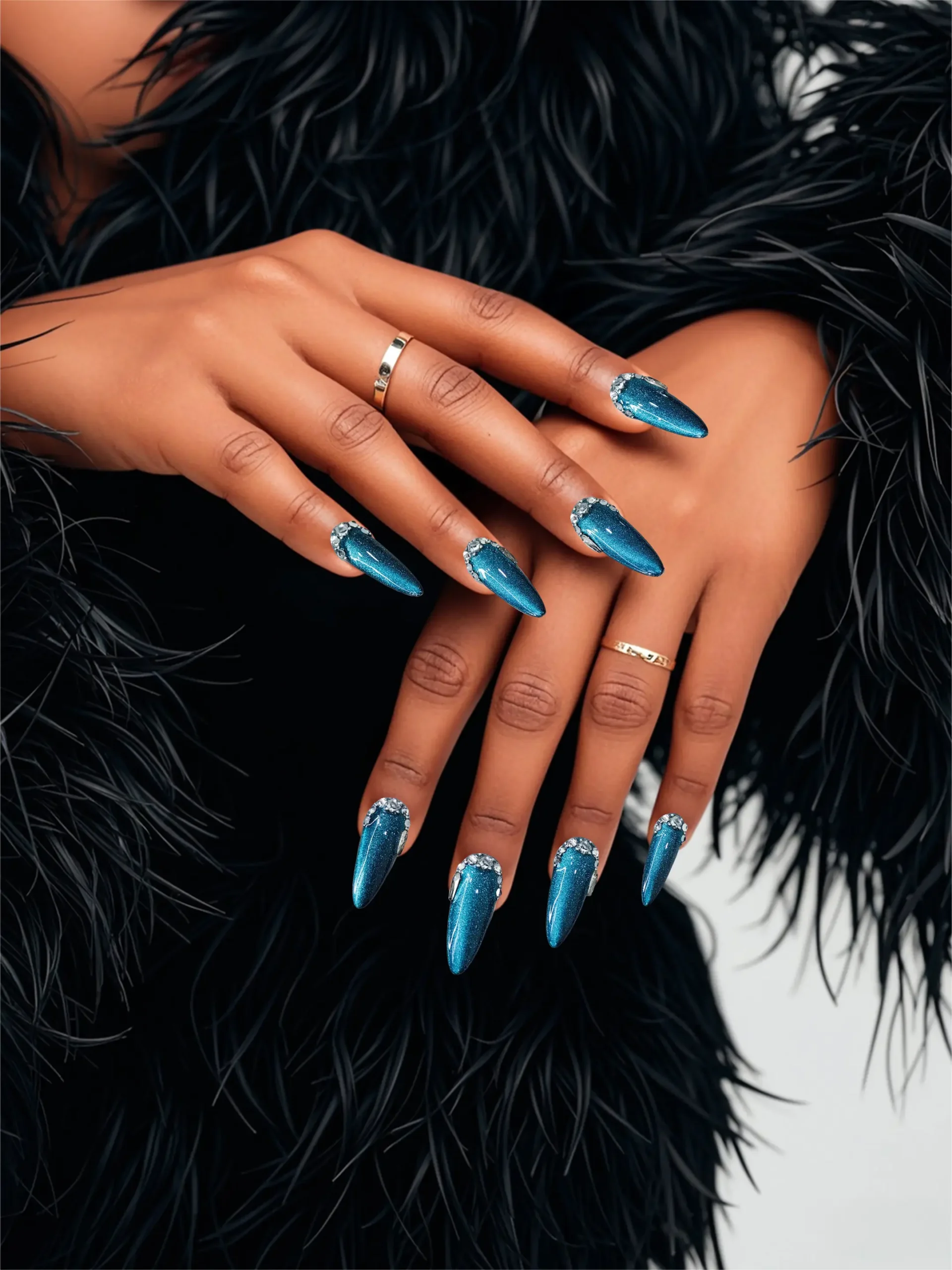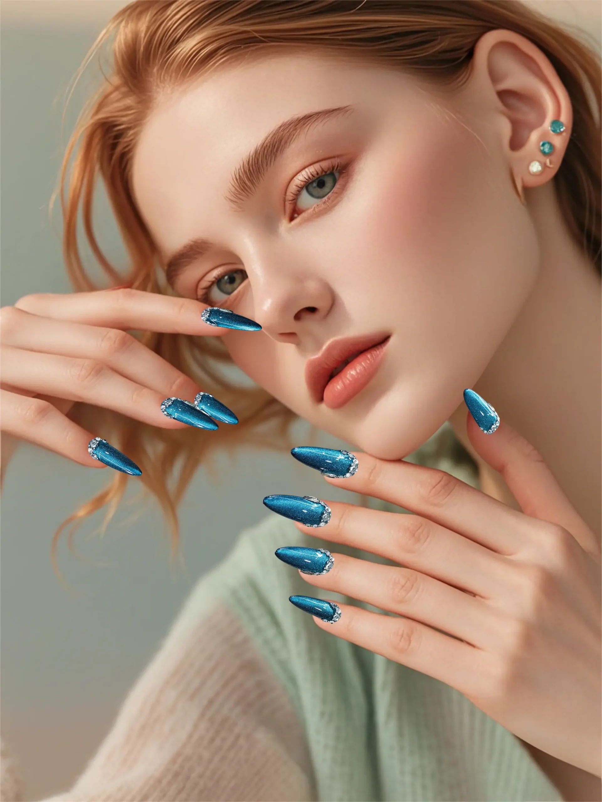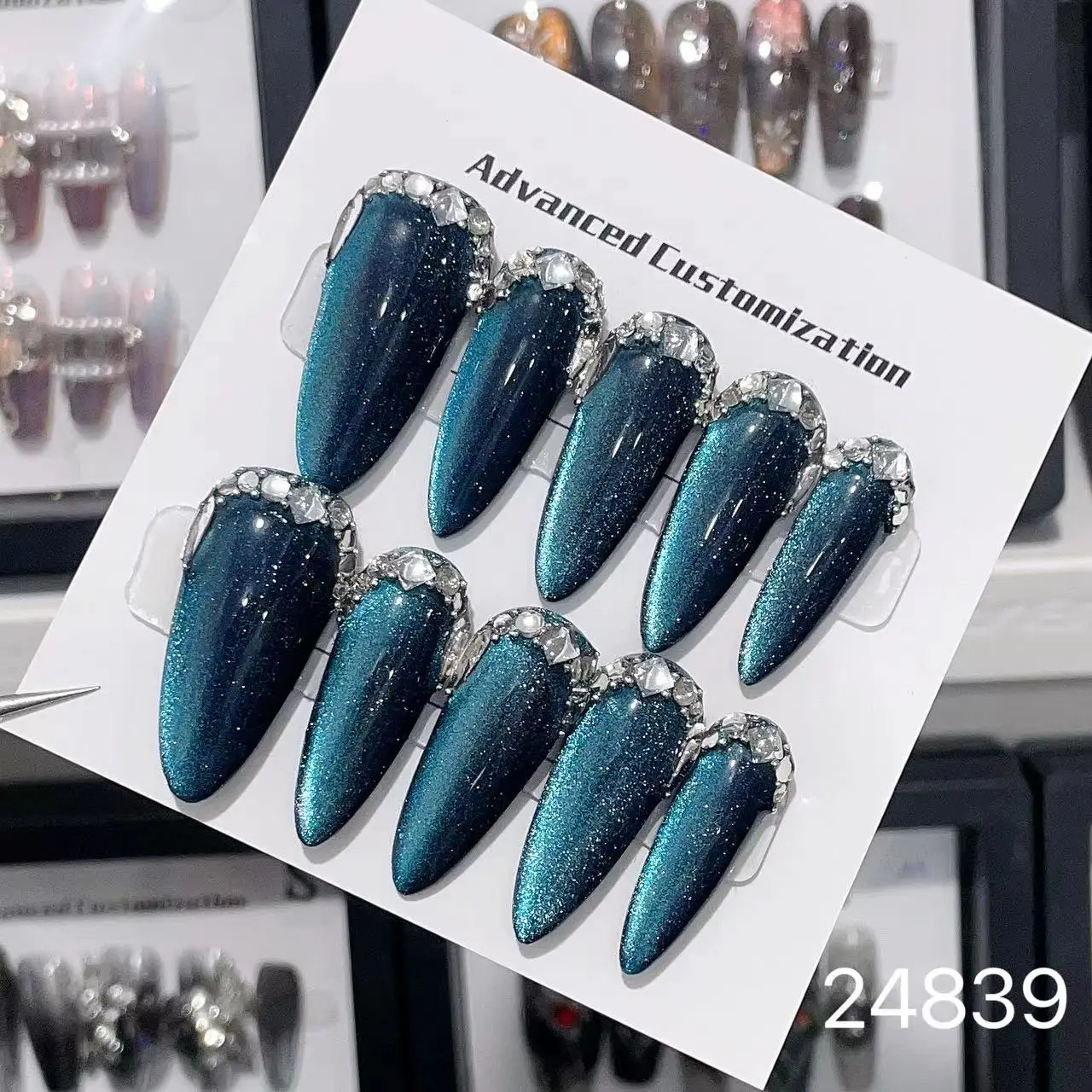 The background has a deep blue-green cat-eye effect, with fine glitter powder. Under the light, it presents a dynamic gradient of luster, resembling a transparent and mysterious deep-sea gemstone. The edge of the nail plate is adorned with a circle shiny diamond decoration, further enhancing the overall delicacy and magnificence.