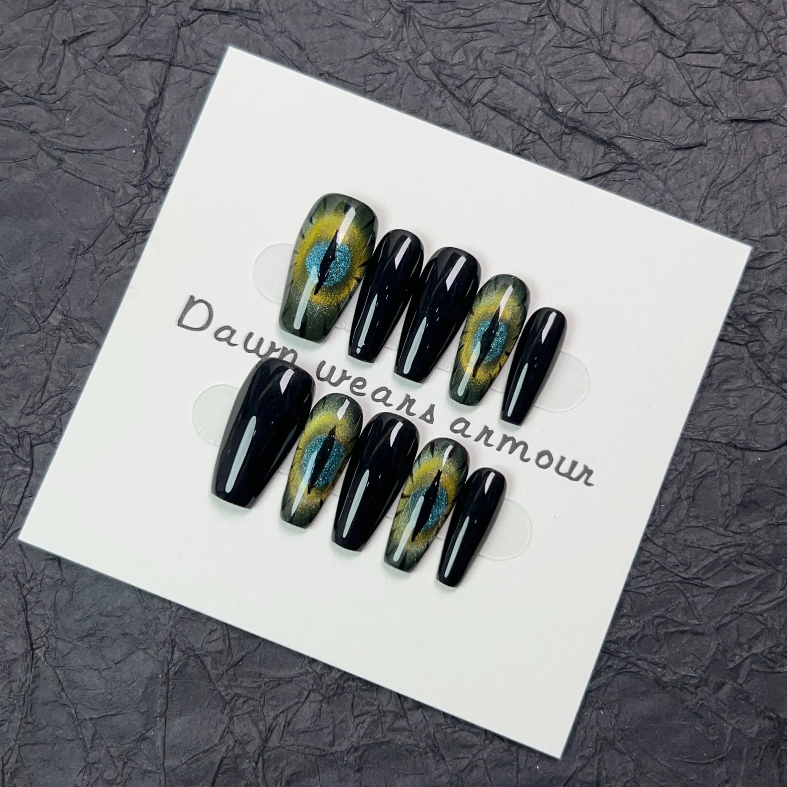 The Eye of the Demon Gradient Cat Eye Nails bring a bold and mysterious look to your fingertips. Each nail is carefully handcrafted with a stunning gradient effect and a mesmerizing cat-eye design, creating a captivating and fashionable appearance. These nails are perfect for anyone who wants to make a statement, whether at casual outings, parties, special events, or even creative photoshoots. Because they are reusable, you can enjoy multiple manicures without creating waste, making them eco-friendly and cost-effective for the modern woman who values both style and sustainability.