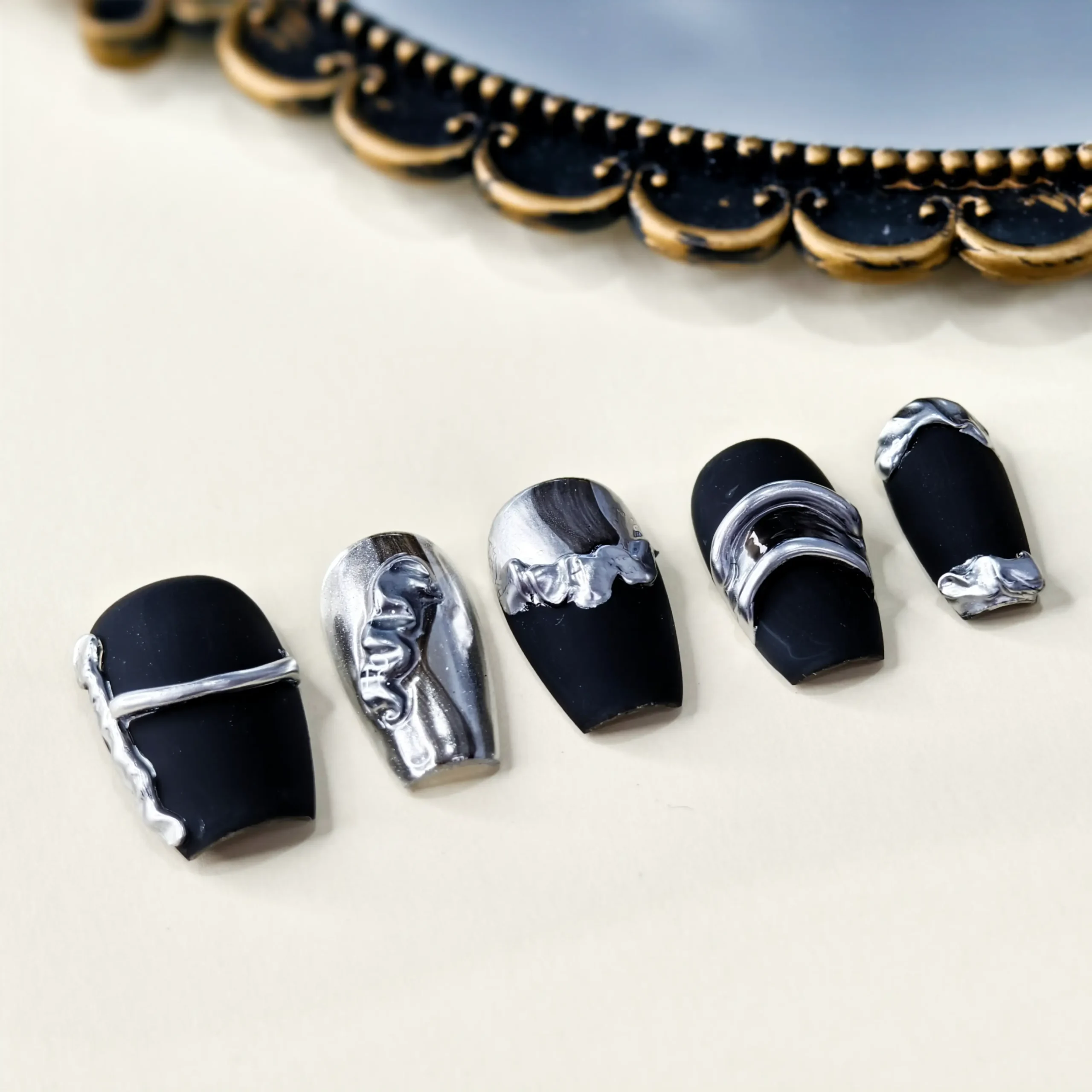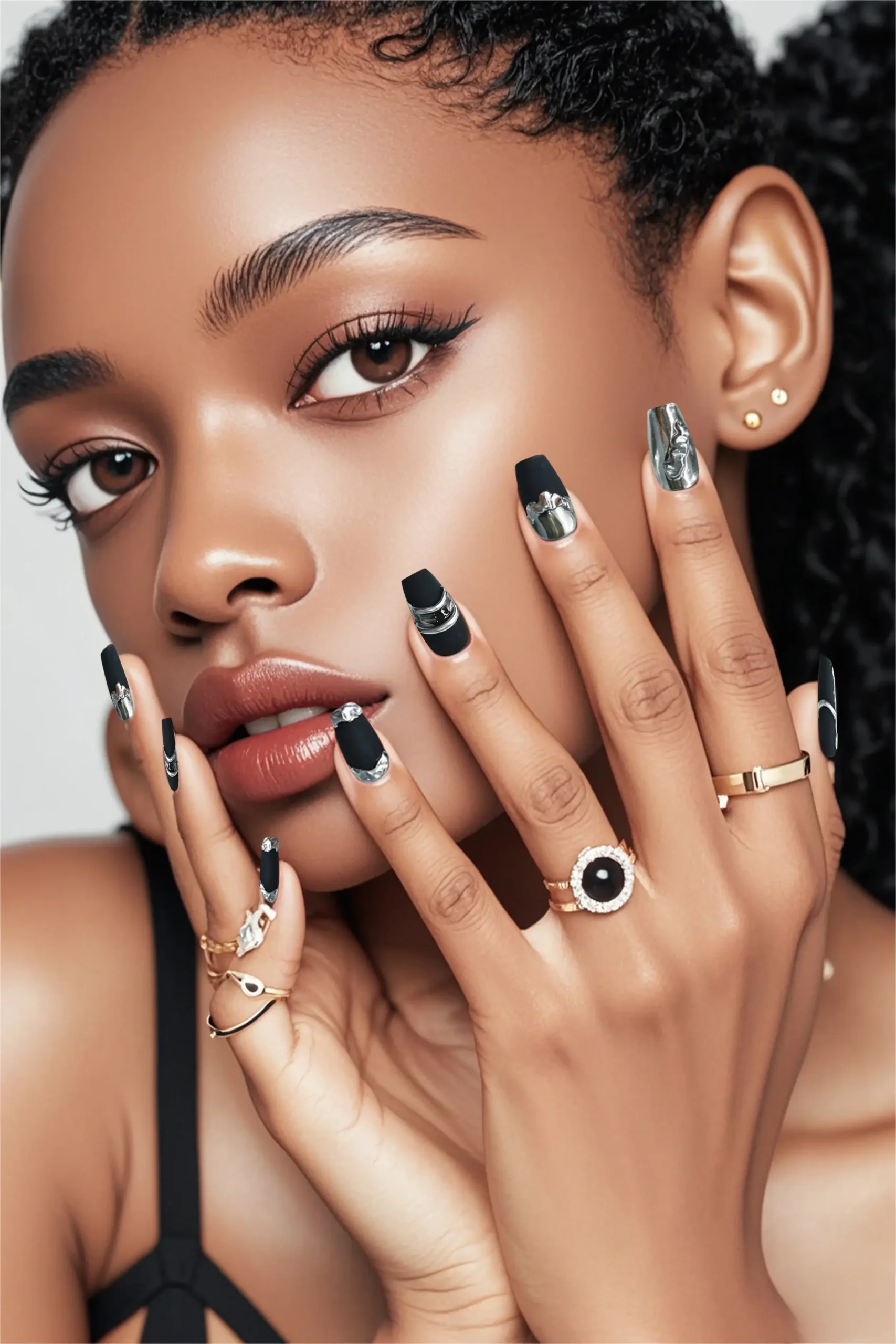 The background color is matte and matte black, complemented by three-dimensional silver metal decorations, including wrapped metal strips, skull-shaped elements, etc., creating a strong visual impact and exuding a sense of individuality and coolness.
