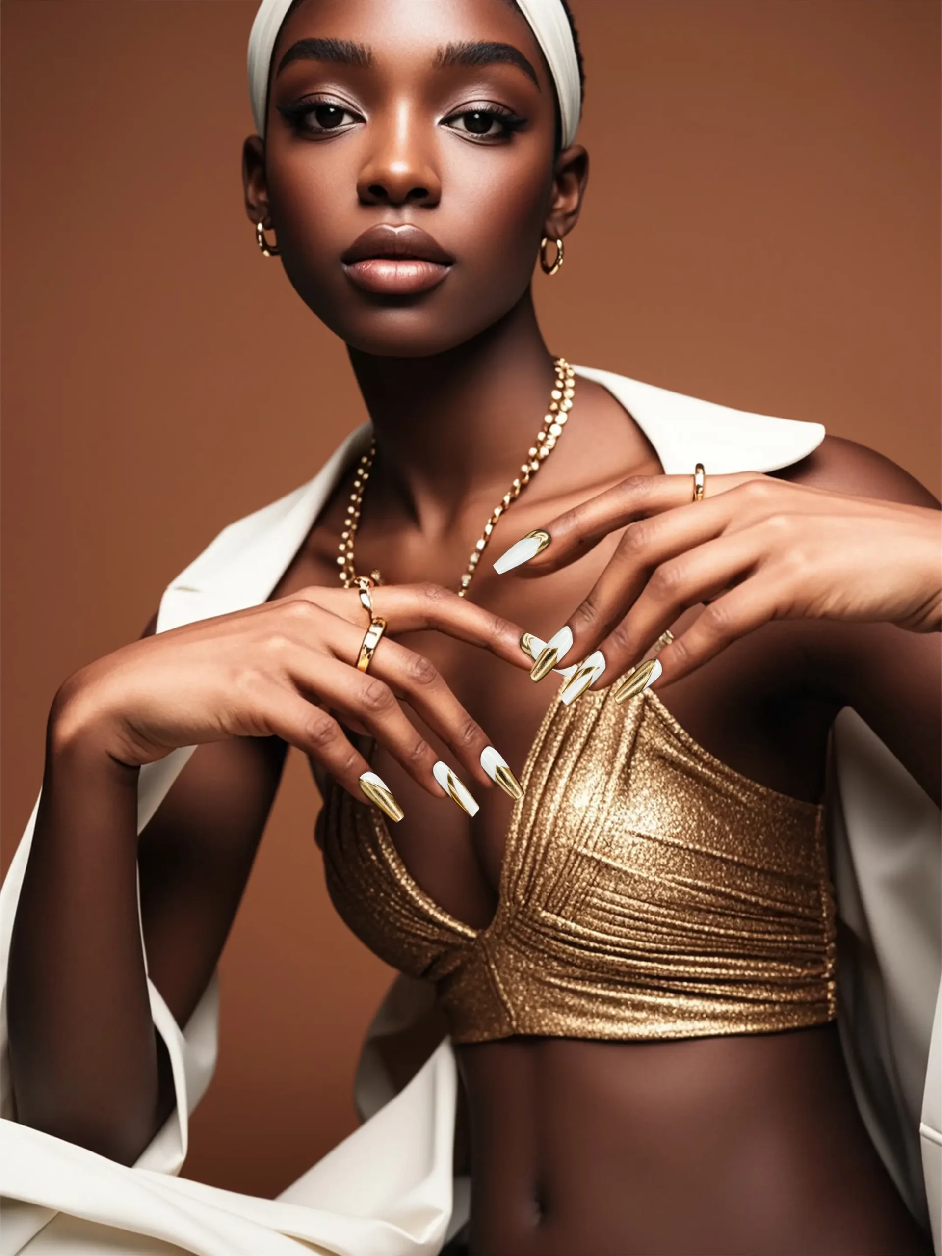 Crafted from high-quality, lightweight, and eco-friendly materials, these press-on nails are durable, comfortable, and reusable. The secure fit ensures long-lasting wear, while the reusable design allows you to change styles whenever you like. Each nail is meticulously designed, balancing classic elegance with modern glamour. The white base symbolizes purity and simplicity, while the gold accents highlight refinement and sophistication.